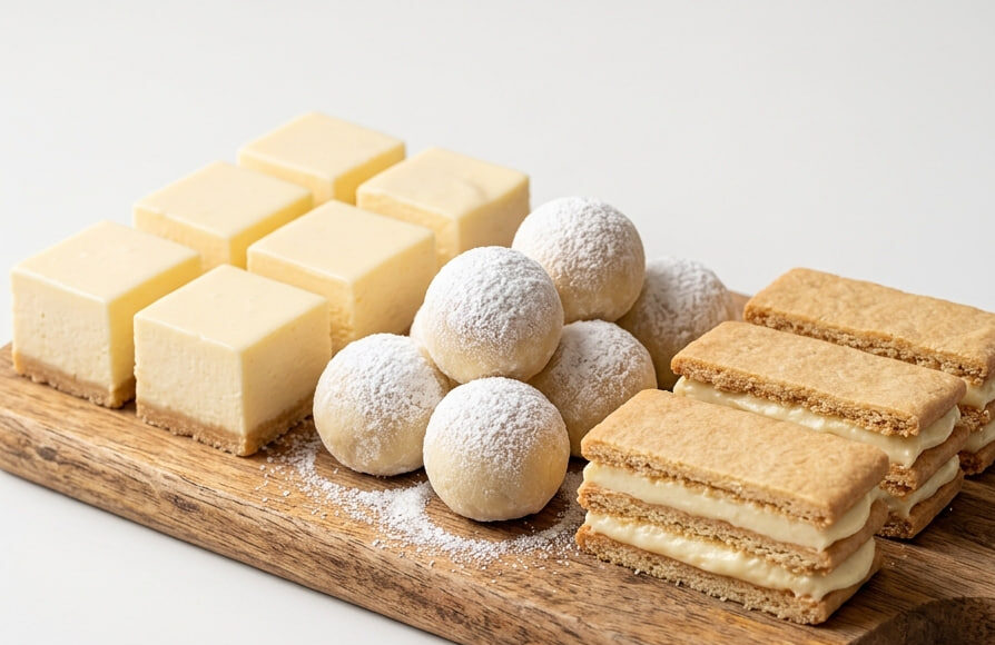 6. Hlađenje i precizno sečenje (Ključ za savršen izgled) Sva tri deserta obavezno stavite u frižider. Moraju da se hlade najmanje 3 do 4 sata (a najbolje preko noći). Hlađenje je ključni korak! Kada se maslac u bazi i krem sir u filu potpuno stegnu, kocke i štanglice ćete moći da isečete oštrim, velikim nožem tako da dobijete savršeno ravne ivice i jasne preseke, baš kao na fotografiji. Servirajte sve zajedno i uživajte u ovom preukusnom belom savršenstvu!