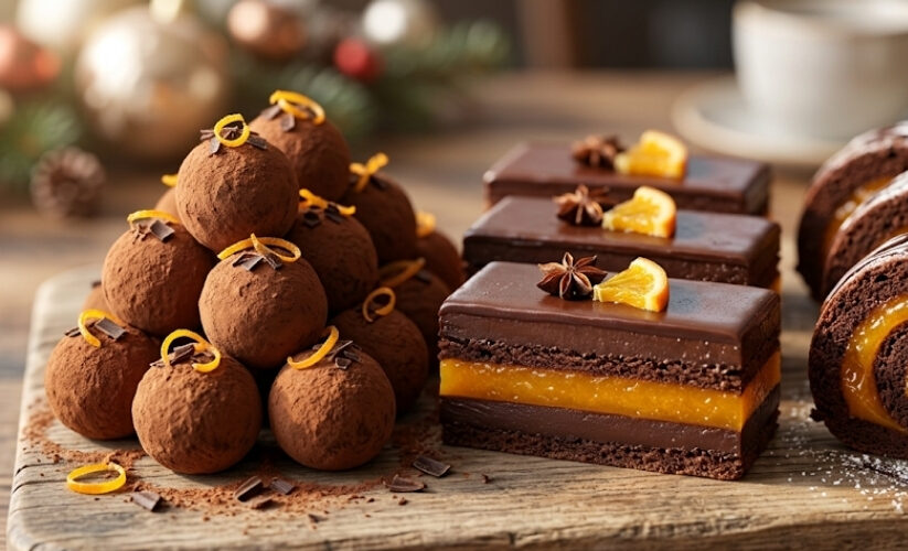 Kao što možete videti na fotografiji, pred vama je prava poslastičarska magija: elegantne trufle (kuglice) uvaljane u kakao, predivan rolat ispunjen narandžastim punjenjem i precizne, slojevite štanglice. Glavni tajni sastojak ove baze je zaleđena pomorandža koja se renda cela (sa korom), što kolačima daje onu autentičnu, snažnu i osvežavajuću aromu.
