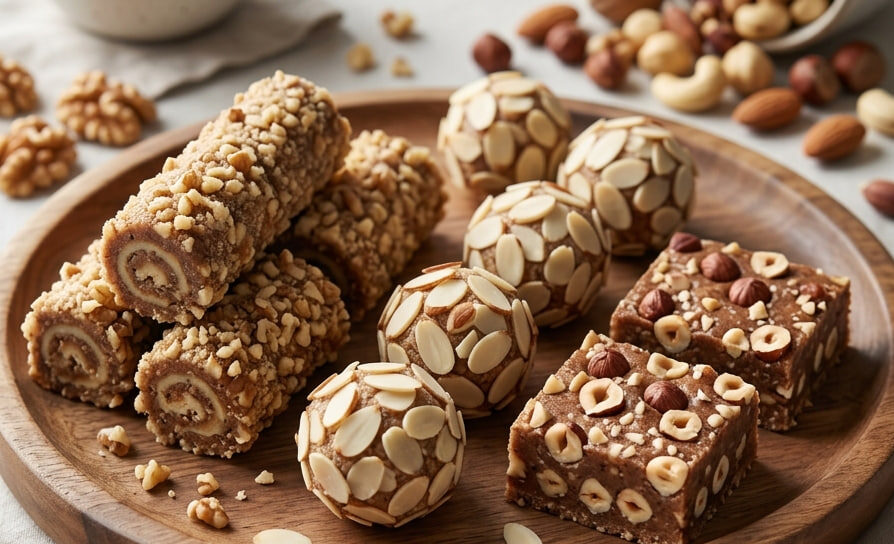 Kao što možete videti na fotografiji, od jedne jedine baze kreirali smo tri potpuno različita vizuelna i ukusna doživljaja: rustične rolate valjane u seckane orahe, elegantne kuglice obložene listićima badema i čvrste kocke bogato posute pečenim lešnicima. Svaki zalogaj donosi prepoznatljivu čokoladnu notu i fantastičnu hrskavost različitih orašastih plodova. Prateći naše korake, lako ćete napraviti ovu raznovrsnu tacnu slatkiša.