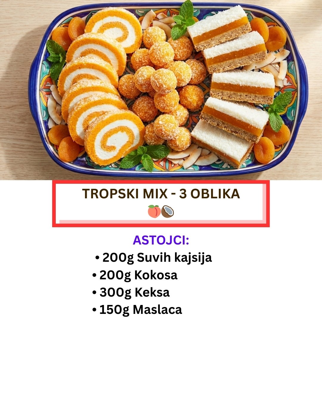 Ovi kolači spajaju dva fantastična ukusa: suve kajsije (koje daju intenzivnu narandžastu boju i kiselkast ukus) i kokos (koji daje belinu i egzotičnu aromu).