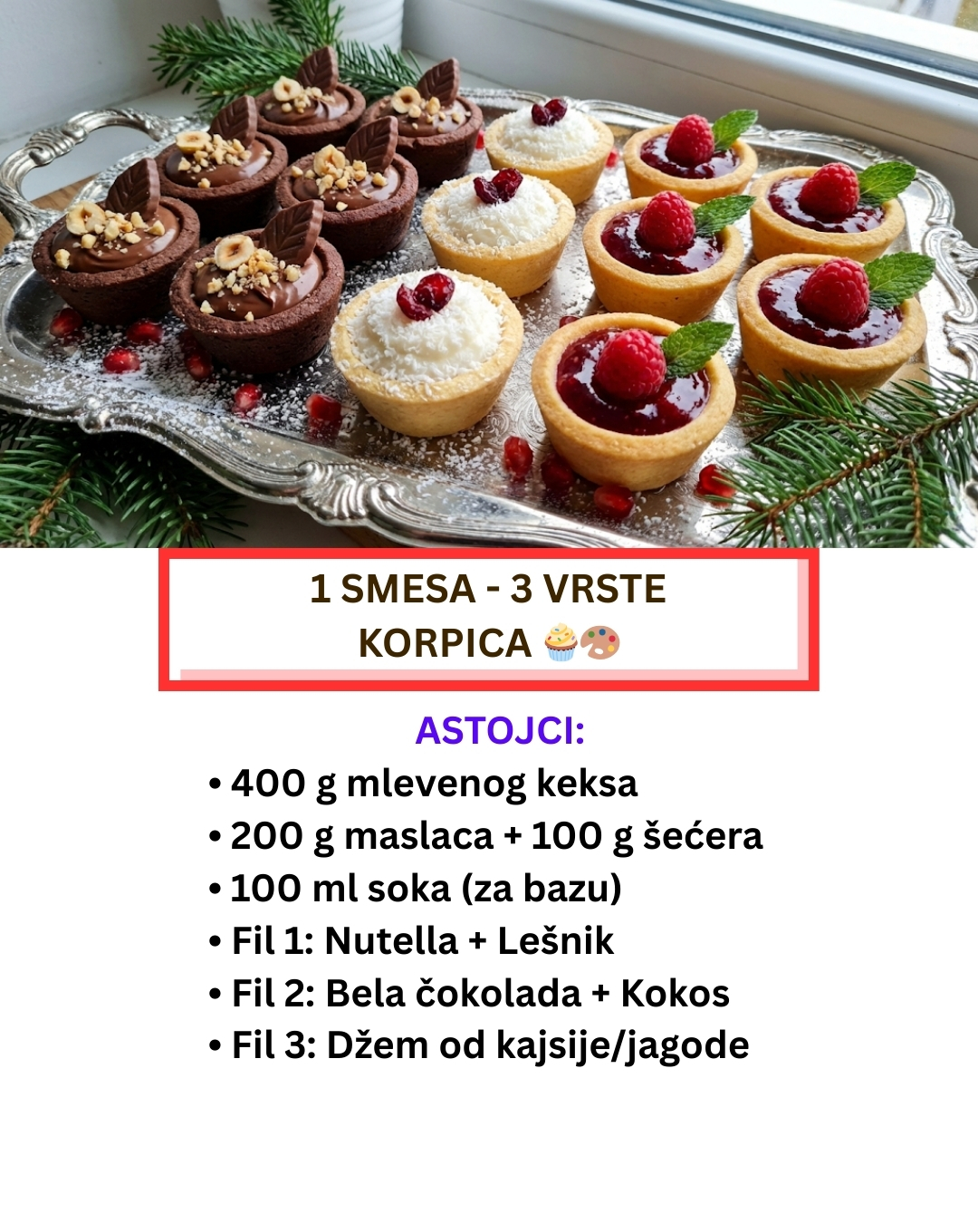 Ovaj recept je dokaz da sitni kolači ne moraju biti komplikovani da bi izgledali svetski. Sa ove tri vrste korpica, vaša tacna će izgledati bogato, šareno i neodoljivo, a vi ćete uštedeti dragoceno vreme.