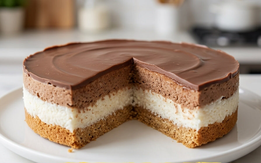 Kao što možete videti na fotografiji preseka, ova torta se odlikuje besprekornim, jasnim slojevima. Osnovu čini zasitan sloj sa mlevenim keksom, sredinu osvežavajući beli sloj prepun kokosa, dok je treći sloj bogat orasima i čokoladom. Sve je krunisano savršenom, sjajnom čokoladnom glazurom. Iako izgleda komplikovano, cela torta nastaje iz samo jedne jedine puding baze!