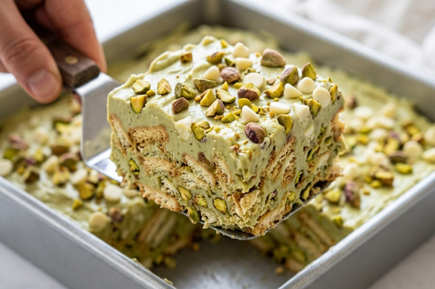 5. Oblikovanje i dekoracija: Pripremite četvrtastu vatrostalnu posudu ili kalup (dimenzija oko 20×30 cm). Izručite smesu sa keksom u kalup, ravnomerno je rasporedite i blago utisnite kako ne bi ostale šupljine sa vazduhom. Preko nje nanesite onaj glatki pistaći krem koji ste sačuvali i lepo ga zagladite špatulom. Na sam vrh nasumično rasporedite preostale seckane pistaće i komadiće bele čokolade.