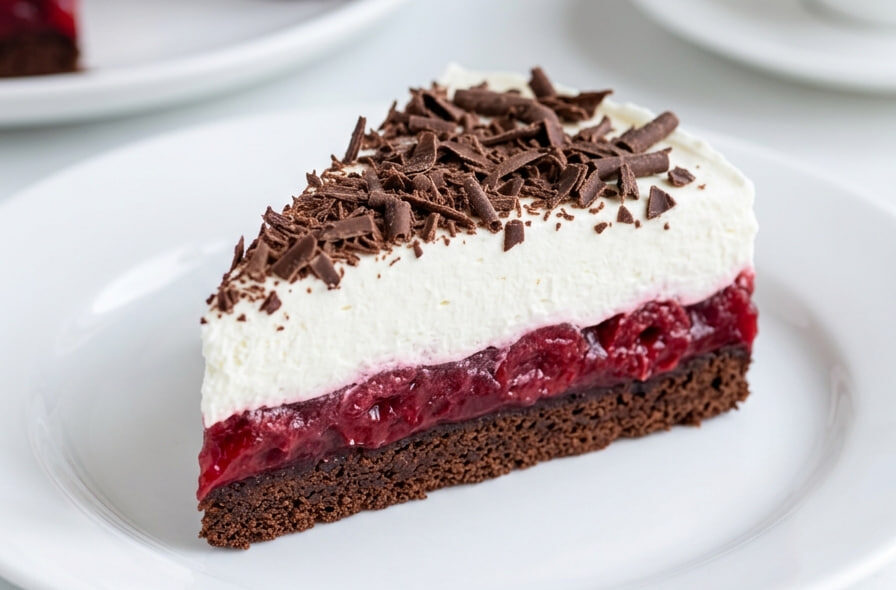 Tajna savršenog preseka ove torte je u kuvanju višanja sa malo gustina, čime se dobija čvrst, ali sočan voćni žele koji ne curi pri sečenju. Tamna podloga od kakao keksa i snežno beli sloj od slatke pavlake stvaraju onaj čuveni kontrast, dok bogat sloj rendane čokolade na vrhu čini svaki zalogaj neodoljivim.