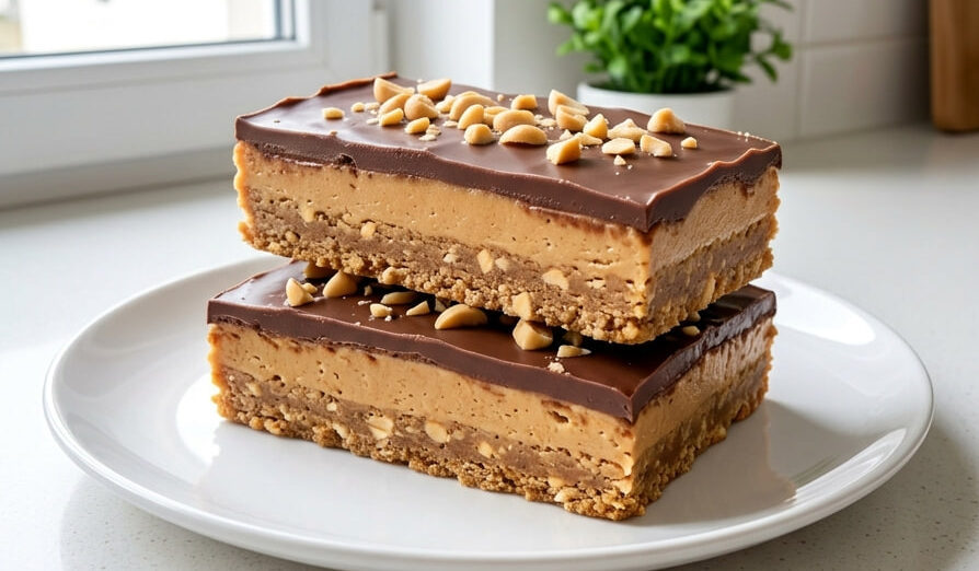 Kao što možete videti na fotografiji preseka, ove štanglice se sastoje od tri predivna sloja. Donji sloj je čvrsta baza od keksa, na nju dolazi izdašan sloj čistog kikiriki putera, a sve se završava moćnom čokoladnom glazurom i komadićima pečenog kikirikija. Priprema ne zahteva paljenje rerne, a rezultat je velika količina izdašnih kolača idealnih za slavlja ili svakodnevno uživanje.