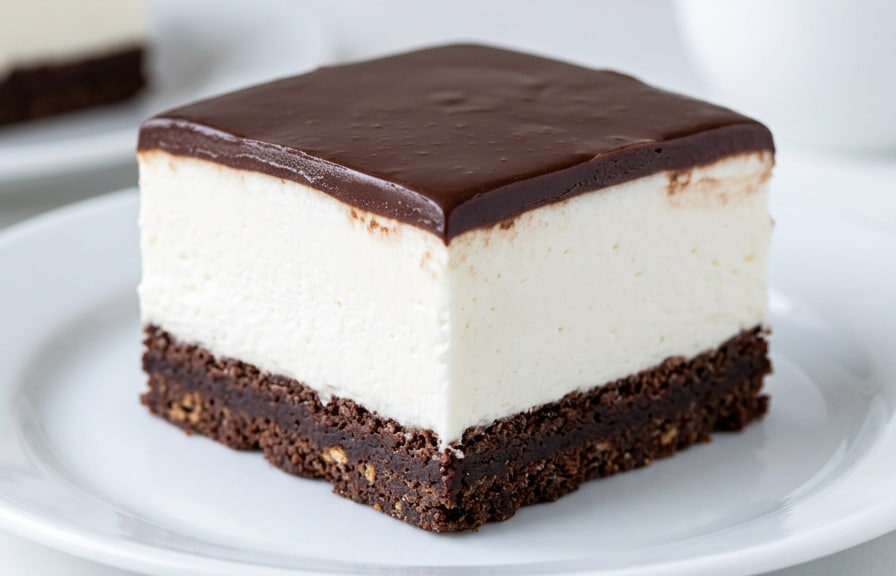 Ovaj recept zadržava prepoznatljivi kontrast – čvrsta, tamna podloga bogata kakaom savršeno se slaže sa izuzetno debelim, svilenkastim slojem belog vanila krema. Kruna celog deserta je sjajna i glatka čokoladna glazura koja blago krcka pri svakom zalogaju. Priprema je neverovatno jednostavna, a presek izgleda kao iz najbolje poslastičarnice!