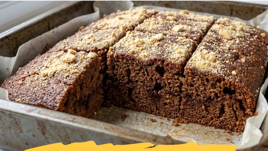 Ovaj kolač se pravi neverovatno lako, jednostavnim mešanjem sastojaka, a rezultat je uvek besprekoran. Na slici vidimo taj savršeni, neodoljivi trenutak kada se špatulom pažljivo podiže jedan predivno isečen, mekani kvadrat ovog kolača pravo ka kameri, otkrivajući njegovu vazdušastu, tamnu unutrašnjost, dok se po vrhu blago rasipaju zlatne mrvice posipa.