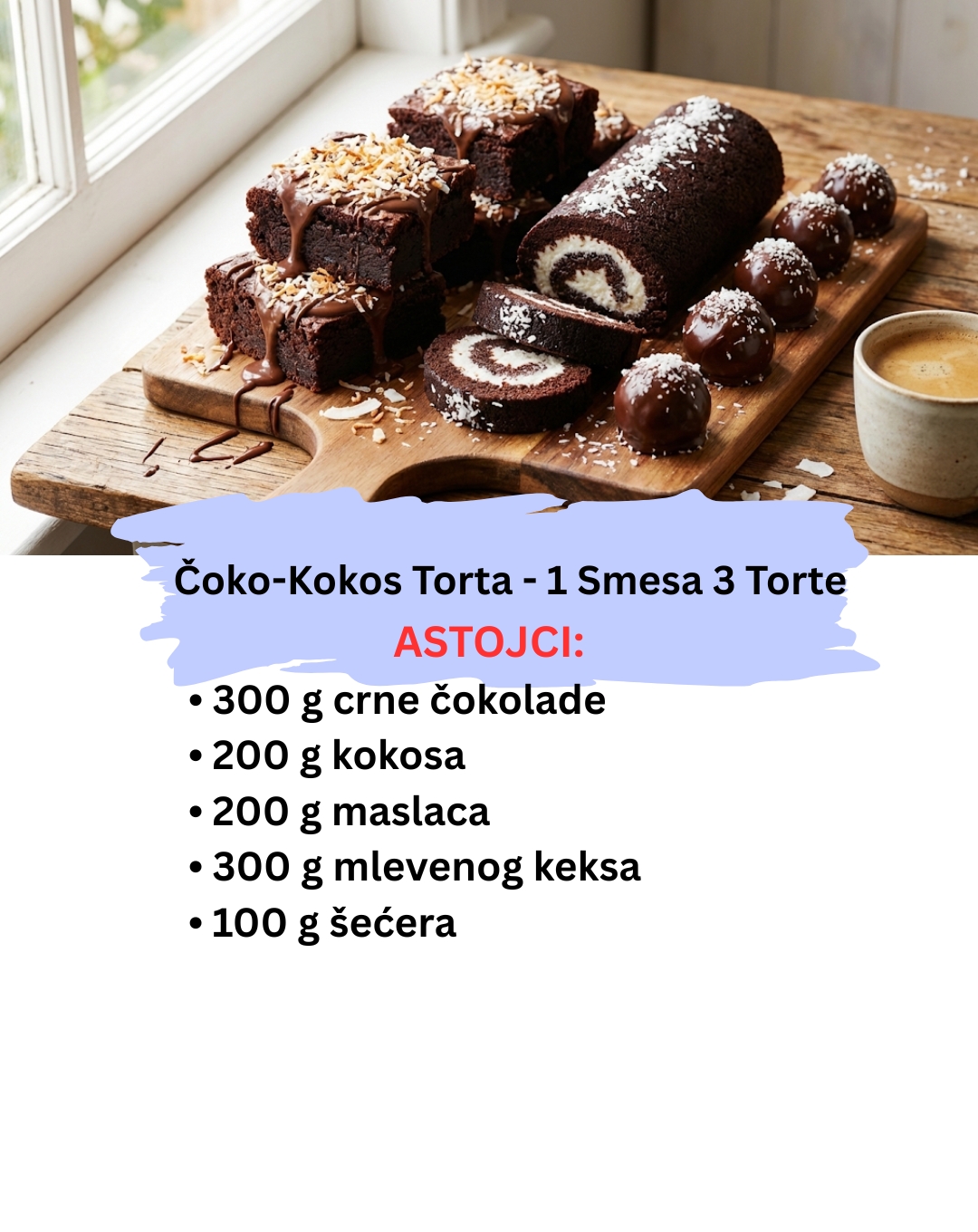 Zamislite scenu: sunčan dan, drveni sto pored prozora i tacna puna tamnih, bogatih kolača koji mirišu na luksuznu čokoladu i egzotični kokos. “Čoko-Kokos Torta” je recept koji vam omogućava da od jedne iste, guste i kremaste smese napravite tri različita oblika: elegantne kocke, rustični rolat i sočne bombe.