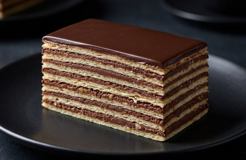 Na slici vidimo taj savršeni, neodoljivi trenutak kada se špatulom pažljivo podiže jedan predivno i izuzetno precizno isečen pravougaoni komad torte pravo ka kameri, otkrivajući nestvarno jasan presek: bezbroj tankih, svetlih kora koje se savršeno ravnomerno smenjuju sa bogatim, tamnim čokoladnim filom prepunim oraha, dok se na samom vrhu sija besprekorno glatka, tamna čokoladna glazura.