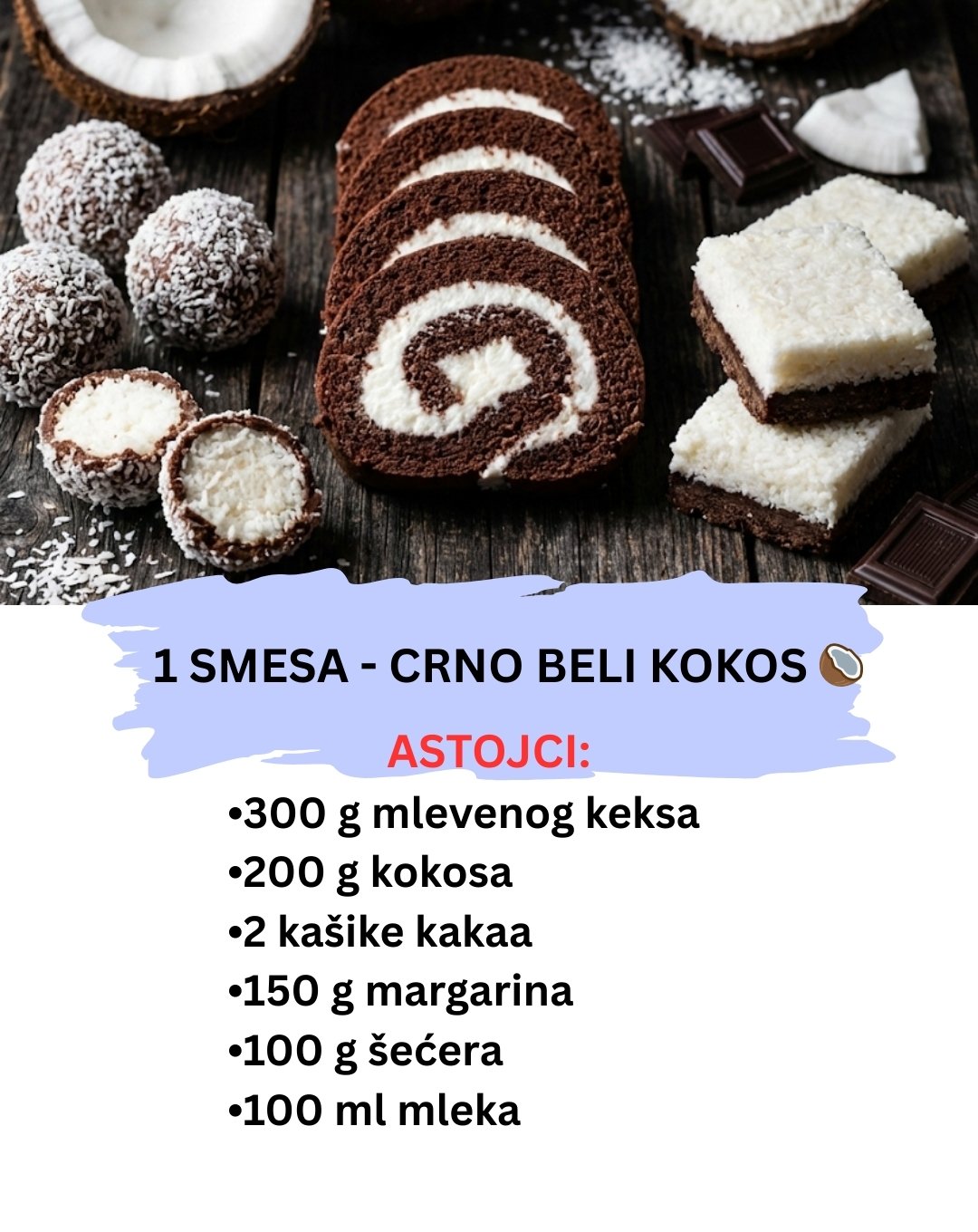 Ovaj recept je idealan za sve koji vole “Bounti” ili “Kinder” stil slatkiša, ali nemaju vremena za komplikovane procedure. Ovde pravimo jednu osnovnu bazu koju delimo na dva dela – crni i beli. Igranjem sa ta dva dela dobijamo tri fantastična oblika: atraktivan Crno-beli rolat, iznenađujuće Punjene kuglice i uredne Dvoslojne štangle.
