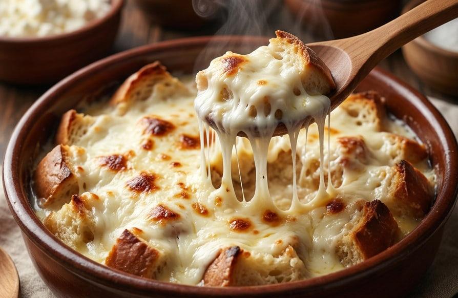Korak 5: Serviranje (Trik za izgled sa slike) Vruću poparu prebacite u glinene posude ili dublje tanjire. Ako želite onaj predivni, zapečeni izgled i sir koji se rasteže kao na fotografiji, preko vruće popare narendajte još malo sira po želji i posudu stavite u zagrejanu rernu na 3-4 minuta (samo pod gornji grejač) dok ne dobije zlatnu koricu. Poslužite odmah!