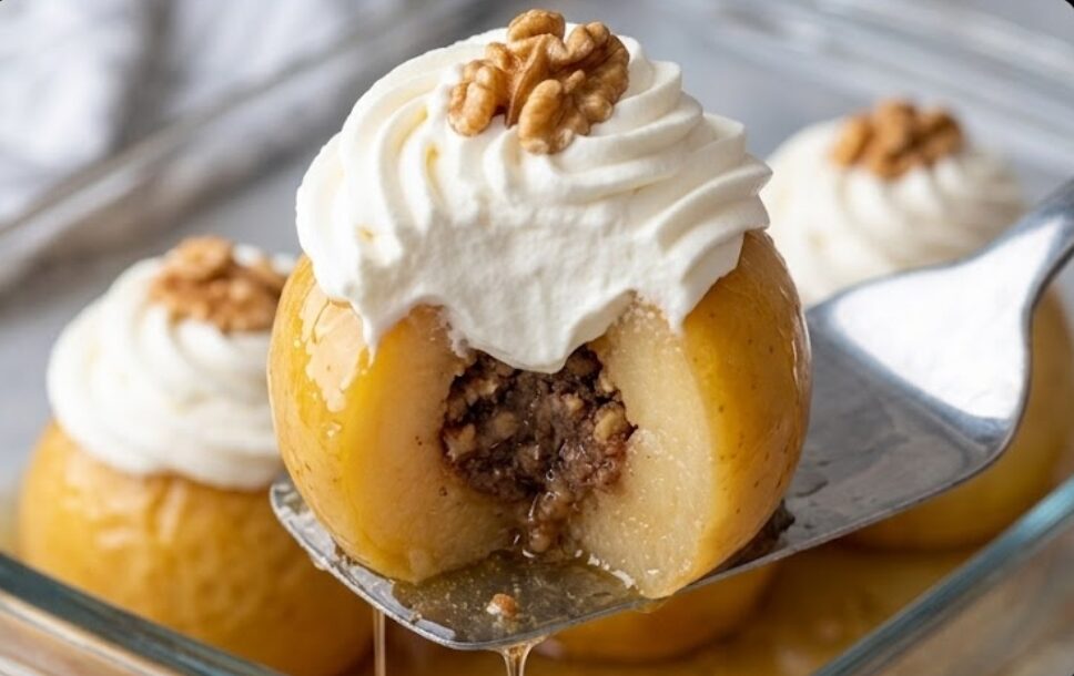 6. Dekoracija i serviranje: Punjene jabuke poređajte u dublju staklenu posudu ili pojedinačne zdelice. Preko svake jabuke prelijte malo preostalog sirupa kako bi ostale sočne i sjajne. U posudi umutite šlag krem, pa pomoću poslastičarskog šprica nanesite bogatu “kapu” od šlaga na svaku jabuku. Na sam vrh šlaga stavite po jednu polovinu celog oraha za savršen vizuelni doživljaj. Pre serviranja, tufahije dobro rashladite u frižideru.