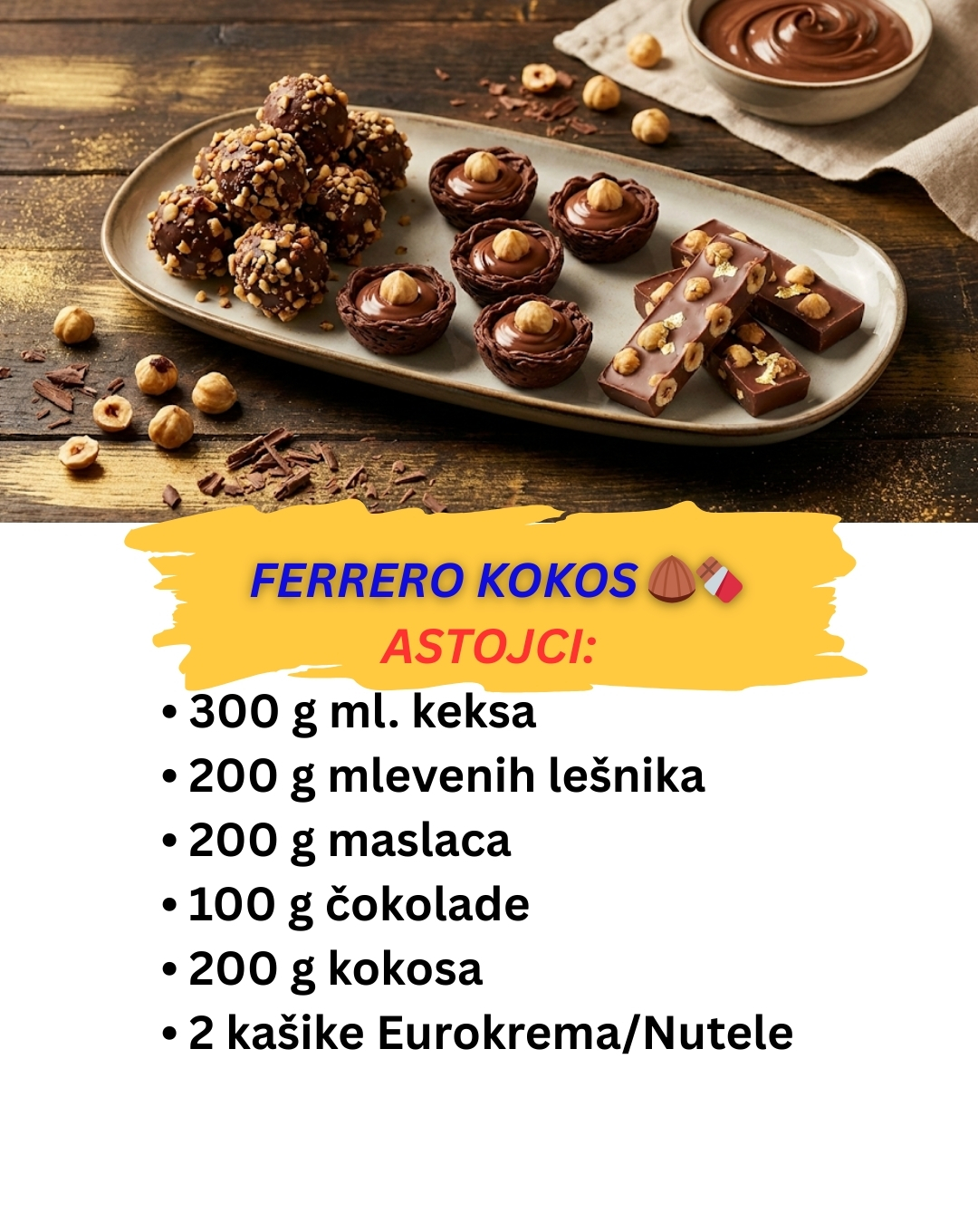 Ovaj recept je inspirisan čuvenim “Ferrero Rocher” kuglicama, ali sa dodatkom kokosa koji celoj priči daje novu dimenziju. Bogat ukus pečenih lešnika, kremaste čokolade i hrskavog keksa nikoga ne ostavlja ravnodušnim.