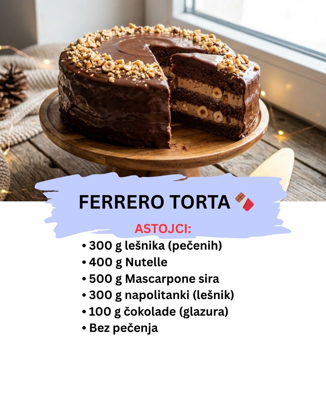 Ako tražite tortu koja će ostaviti sve goste bez daha, a ne želite da provedete sate pored rerne pekući kore, “Ferrero Torta” je pravi izbor. Inspirisana čuvenim zlatnim kuglicama, ova torta donosi savršen sklad hrskavih lešnika, kremaste Nutelle i bogate čokolade.