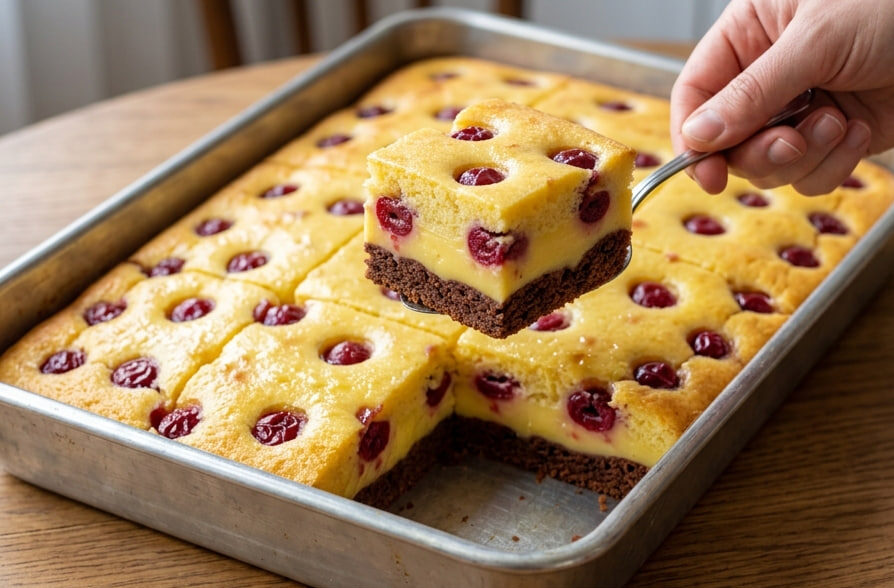 Kremasti puding kolač sa višnjama je fantastičan, bogat desert koji vizuelno podseća na složene torte, a zapravo se priprema neverovatno lako jer se svi slojevi peku zajedno. Njegova najveća čar leži u predivnom kontrastu tekstura i ukusa – na dnu se nalazi vazdušast, mekani biskvit sa bogatim ukusom kakaa, u sredini je svilenkasti krem od vanile, dok kiselkaste višnje na vrhu razbijaju slatkoću i donose savršeno osveženje.
