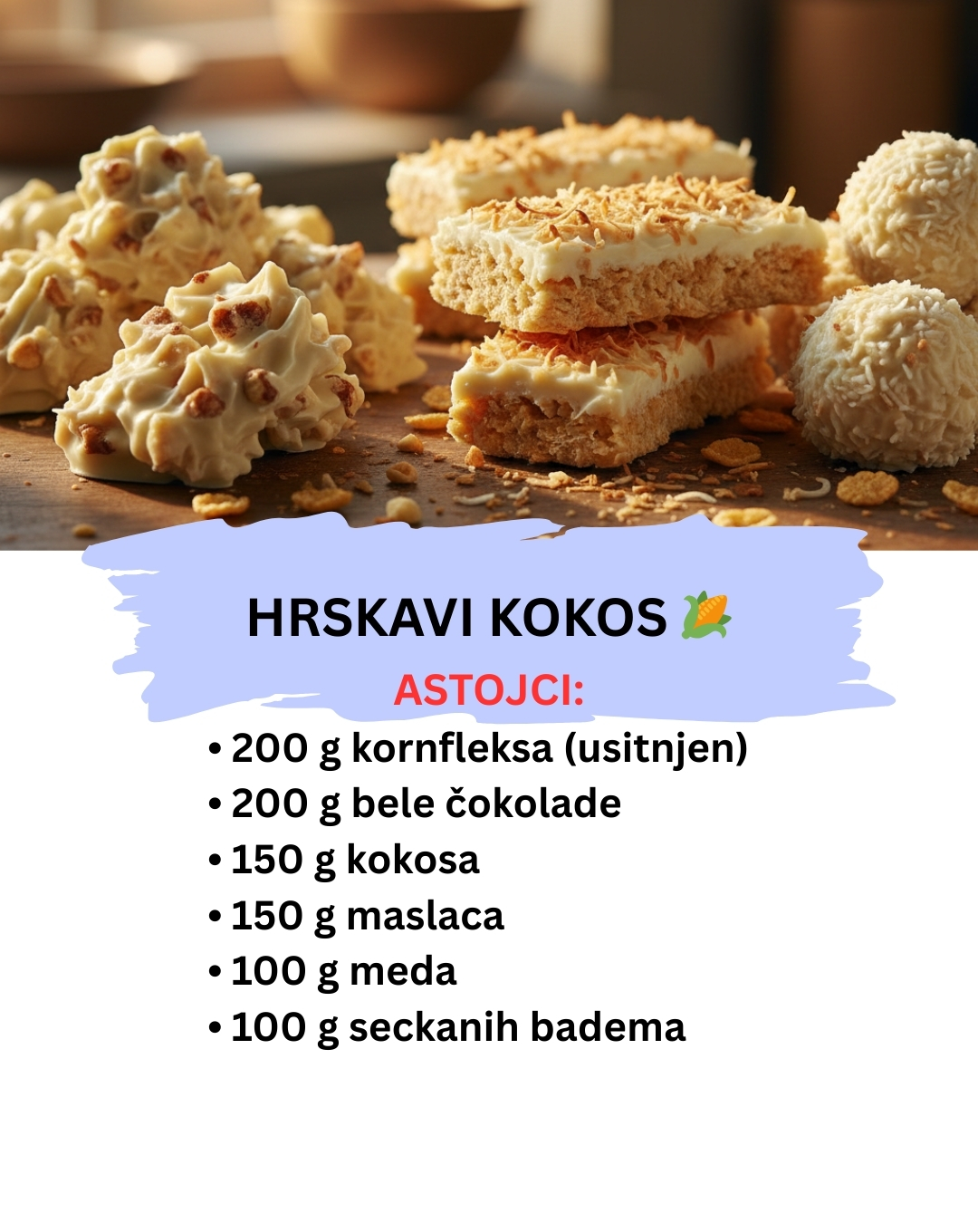 Kada pomislimo na sitne kolače, obično zamišljamo meke kuglice ili kremaste štangle. Međutim, ponekad je našem nepcu potrebno nešto drugačije – nešto što krcka. Ovaj recept je upravo to: savršen spoj hrskavosti kornfleksa, slatkoće bele čokolade i egzotične arome kokosa.