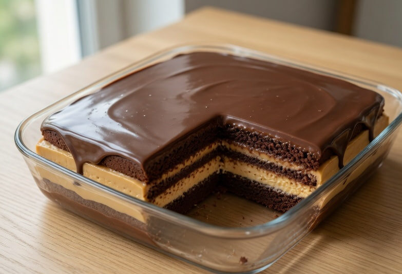 Korak 4: Slaganje kolača u vatrostalnoj posudi Pripremite četvrtastu staklenu vatrostalnu posudu (kao sa slike) koja odgovara dimenzijama vaših kora. Na dno stavite prvu čokoladnu koru. Preko nje ravnomerno nanesite prvu polovinu karamel krema. Zatim stavite drugu koru, blago pritisnite, pa nanesite drugu polovinu krema. Na kraju, prekrijte sve trećom čokoladnom korom i blago pritisnite rukama da se slojevi spoje i poravnaju.