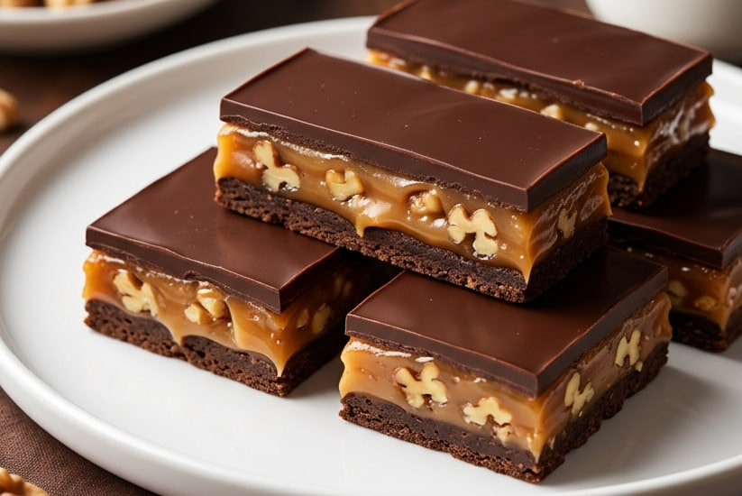 Kada tražite desert koji izgleda neverovatno elegantno, a sprema se brzo i bez paljenja rerne, ove karamel-orah štanglice su apsolutni pobednik. Ovaj kolač spaja tri fantastične teksture – prhku čokoladnu podlogu od keksa, lepljivi, bogati središnji sloj od karamela i krckavih oraha, i glatku završnicu od tamne čokolade.