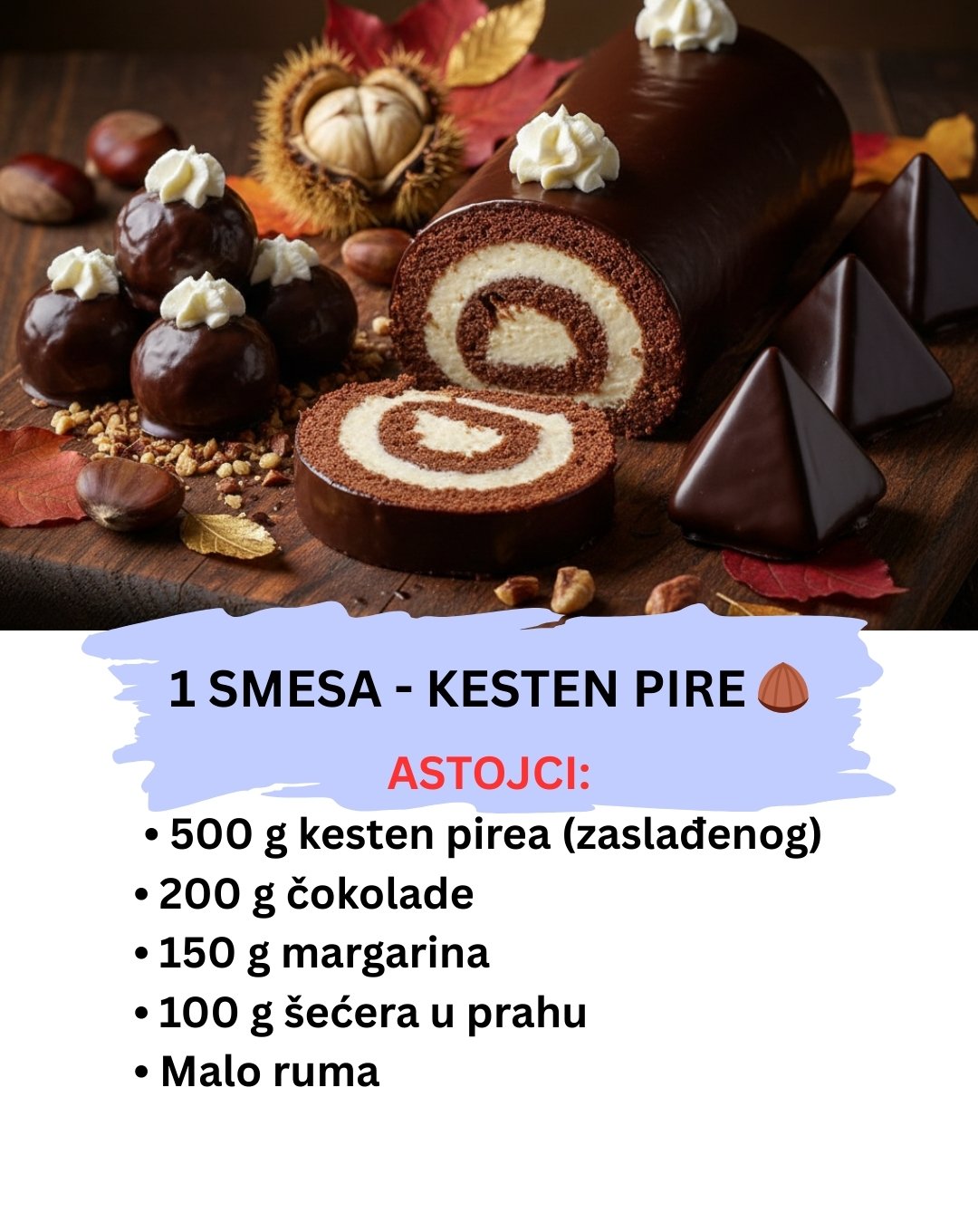 Od te jedne mirisne smese oblikovaćemo tri vrste kolača koji izgledaju kao mala umetnička dela: elegantni Kesten rolat, sočne Kesten kuglice prelivene čokoladom i dekorativne Piramide. Ovi kolači su idealni za slave, Božić ili kao prefinjen desert uz popodnevnu kafu.
