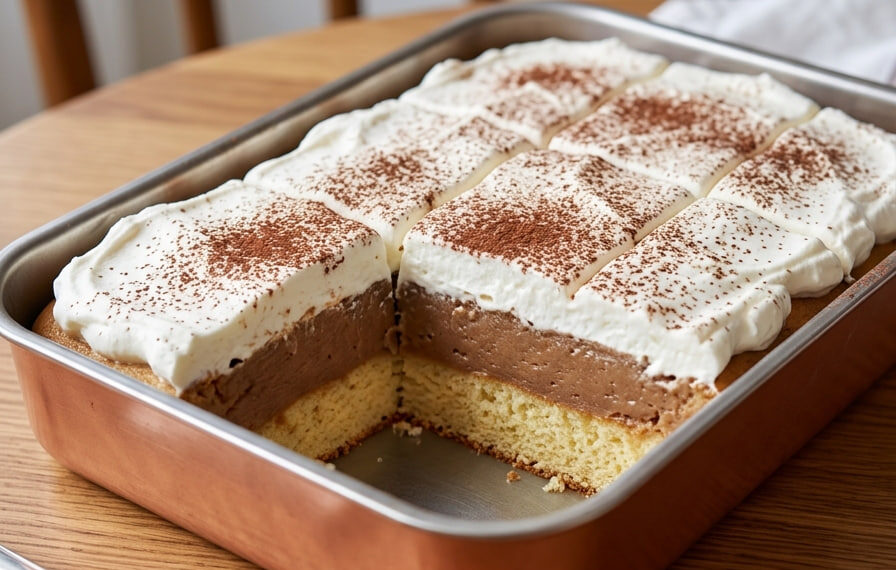 Dekoracija i hlađenje: Kolač obavezno ostavite u frižideru nekoliko sati da se dobro stegne. Neposredno pre sečenja na kocke, površinu bogato pospite kakao prahom koristeći malu cediljku za ravnomerniji izgled.