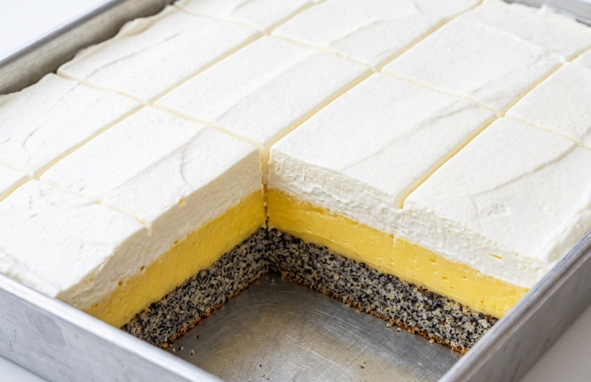 Kombinacija maka i vanile je pravi klasik koji budi najlepša sećanja na starinske poslastice, ali ovaj kolač donosi tu tradiciju u modernom, izuzetno kremastom izdanju. Njegov presek otkriva predivan kontrast – potpuno tamni biskvit od maka, jarko žuti krem od vanile i snežno beli sloj slatke pavlake na vrhu.