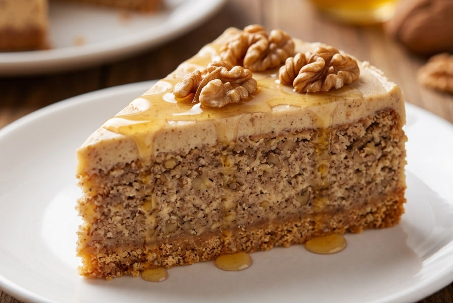 Ova torta vizuelno podseća na luksuzne poslastice iz najboljih restorana, a zapravo se priprema veoma brzo. Njena tajna leži u savršenom balansu: hrskava podloga od keksa, izuzetno bogat fil od mlevenih oraha koji je osvežen maskarpone sirom, i predivan, zlatni preliv od čistog meda na vrhu. Neodoljivo, zar ne?