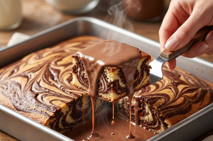 7. Zalivanje kolača: Čim izvadite pečen kolač iz rerne, dok je još uvek vreo, lagano ga izbockajte čačkalicom na više mesta. Odmah ga prelijte vrućim čokoladnim prelivom. Možda će vam se učiniti da ima previše tečnosti, ali ne brinite – vreo biskvit će u roku od desetak minuta upiti svaku kap preliva i postati neverovatno sočan.