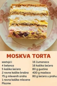 Moskovska torta je jedna od onih poslastica koje ostavljaju utisak još na prvi pogled. Raskošna, bogata, elegantna i puna različitih tekstura – od hrskavih korica, preko laganog šlaga, pa sve do kremastih žumanaca i voća koje sve osvježava. Ovo je torta koja se priprema za posebne prilike i koja nikoga ne ostavlja ravnodušnim.