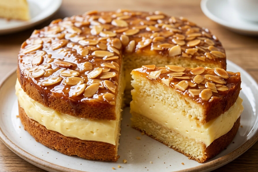 Kao što možete videti na našoj fotografiji, presek ovog kolača je apsolutno savršen. Izdašan sloj glatke vanile nalazi se između dva sloja sunđerastog testa, dok vrh krasi sjajna, zlatna kruna od pečenih listića badema. Iako izgleda kao da je izašao iz najekskluzivnije poslastičarnice, uz pravi recept možete ga lako napraviti u svojoj kuhinji!