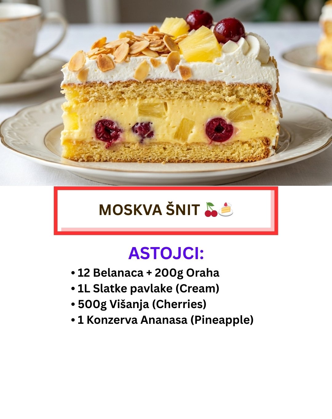 Mnogi misle da je priprema ove torte komplikovana, ali uz pravi recept, ona postaje uživanje. Spoj hrskavih korica od oraha, svilenkastog vanila krema i osvežavajućeg voća (višanja i ananasa) čini je idealnom za svaku svečanu priliku.