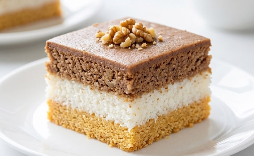 Na slici vidimo taj savršeni, neodoljivi trenutak kada se špatulom pažljivo podiže jedan predivno isečen, pravougaoni komad torte pravo ka kameri, otkrivajući nestvarno jasan i privlačan presek: zlatno-žutu osnovu od keksa, snežno beli srednji sloj od kokosa i bogati završni nivo od mlevenih oraha, dok sve to kruniše glatka površina dekorisana polovinom jezgra oraha.
