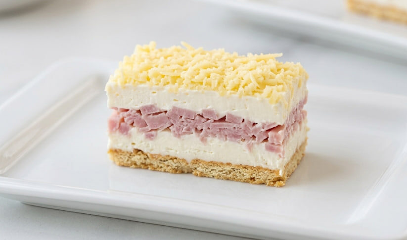 Kao što možete videti na našoj fotografiji, svaki sloj ove slane torte je pažljivo složen. Mekani krekeri čine savršenu podlogu, dok se izdašan kremasti fil od sira i majoneza savršeno stapa sa bogatim središnjim slojem od seckane šunke. Završni dodir rendanog kačkavalja daje joj prepoznatljiv, neodoljiv izgled.