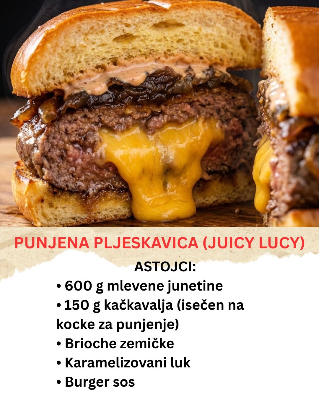Jao, pogledajte samo ovu sliku! To nije obična pljeskavica, to je Juicy Lucy – kraljica svih burgera! Kada je zagrizete, iz sredine curi topljeni sir… ma, nema ništa lepše.