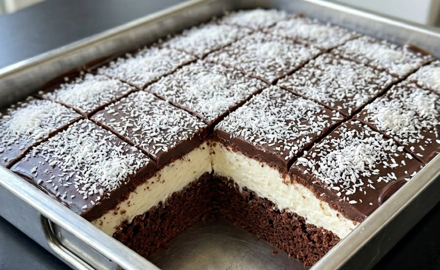 Ovaj fantastičan slojeviti kolač sastoji se od neverovatno mekanog tamnog biskvita, izdašnog belog fila punog kokosa i sjajne čokoladne glazure na samom vrhu. Kako bi biskvit bio savršeno vazdušast, osnovnom receptu smo dodali prašak za pecivo i malo mleka. Beli fil smo obogatili šećerom i vanilin šećerom za savršen balans, dok dodatak ulja u čokoladnu glazuru sprečava njeno pucanje prilikom sečenja.
