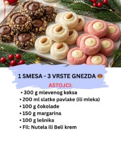 1. Lešnik Gnezda (Ferrero): Pravite kuglice. Uvaljajte ih u krupno seckane lešnike. Vrhom varjače (drške) napravite udubljenje u sredini.