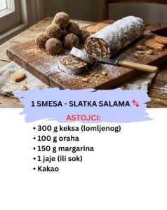 Ovo je recept koji budi uspomene! Slatka salama (ili čokoladna salama) je klasik koji su naše bake stalno pravile. Zašto? Zato što je jeftin, a izgleda prelepo kada se iseče. Tajna onog lepog “šarenog” preseka je u načinu na koji lomite keks.