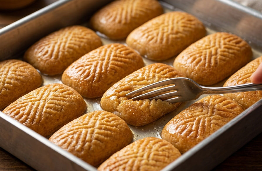 Korak 5: Prelivanje sirupom (Zlatno pravilo) Čim izvadite vrele urmašice iz rerne, odmah ih ravnomerno prelijte onim potpuno ohlađenim sirupom. Ostavite ih u plehu na sobnoj temperaturi da dobro upiju sav sirup pre služenja. Najlepše su kada odstoje nekoliko sati i postanu potpuno mekane.