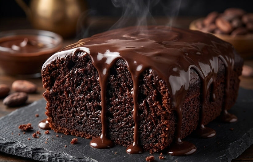 Iako je posluženje na tamnoj, kamenoj dasci izuzetno elegantno, prava magija se dešava u onom trenutku kada se špatulom pažljivo podiže jedan predivan, izdašan komad ovog kolača pravo ka kameri, pokazujući njegovu savršeno mekanu, sunđerastu teksturu, dok se preko celog parčeta zavodljivo sliva bogata, topla i sjajna čokoladna glazura.