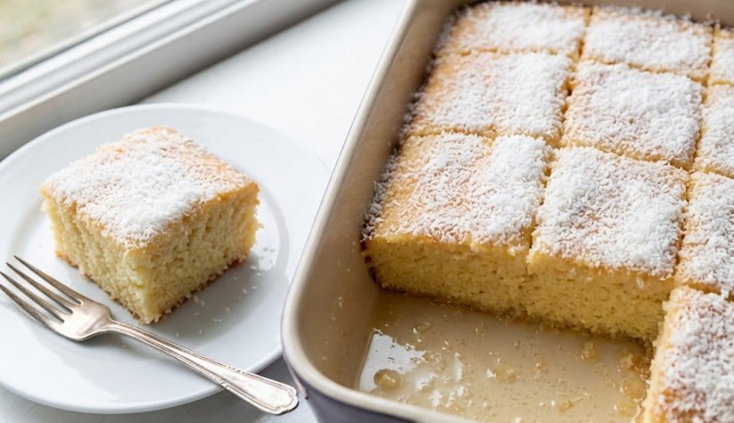 Na slici vidimo savršeno isečene svetle kocke u pekaču, prelivene sirupom i bogato posute kokosovim brašnom, dok jedno parče posluženo na belom tanjiru uz viljušku prosto mami da ga odmah probate.