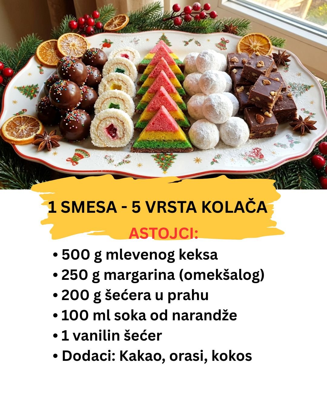 Ovo je recept zlata vredan! U jednoj velikoj činiji umesite osnovnu smesu, podelite je na 5 delova i za manje od pola sata na stolu imate raskošnu tacnu sa 5 različitih vrsta sitnih kolača. Bez pečenja, bez prljanja gomile sudova i bez stresa!