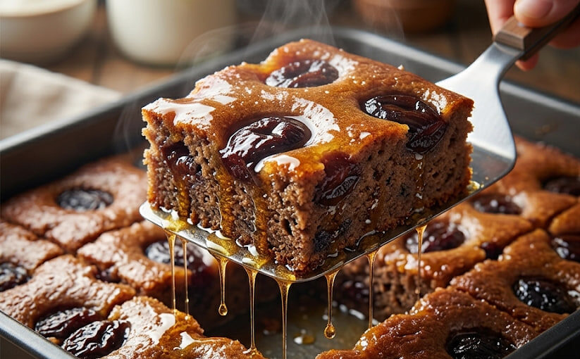 Kao što možete videti na našoj fotografiji, svaki komad ovog kolača je bogato natopljen sirupom, dok mu komadići suvih šljiva i cimet daju onu prepoznatljivu, tamniju boju i bogat ukus. Veoma se lako priprema jer se većina sastojaka meri na čaše, a rezultat je kolač koji se doslovno topi u ustima.
