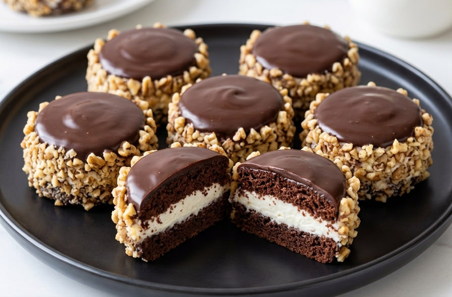 Sečenje i filovanje: Pomoću male okrugle modle ili rakijske čašice secite krugove od ohlađenog biskvita. Na jedan krug nanesite bogat sloj kreme, preklopite ga drugim krugom i blago pritisnite.