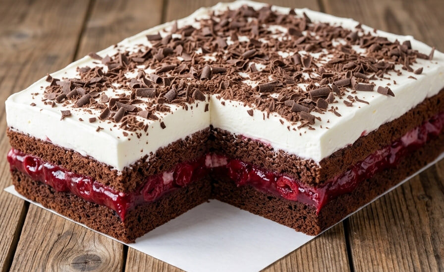 Ovaj kolač se priprema u jednom plehu, a njegovi slojevi su pravo savršenstvo. Tamni kakao biskvit preliva se bogatim, ukuhanim filom od višanja, dok gornji sloj čini osvežavajuća slatka pavlaka obogaćena čokoladnim strugotinama. Savršen je za nedeljno popodne, praznike ili iznenadne goste.